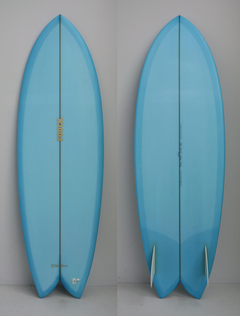 - Lastly is our more performance style fish. Still remaining true to the original fish design, this version has some mild tweaks to the outline and rocker to allow quicker direction changes and a much more performance based approach. Slight bump/watered down flyer behind the fin to allow a break in the rail line helping the board to turn on a dime when surfed off the tail, this is also helped by an increase in rail line rocker from the same spot. Deeper concaves within the predominant Vee bottom through the tail help create even more lift when first taking off, more planing speed straight off the bat but also a huge amount of hold from the Vee bottom when on rail, utilising the best parts of both these bottom contours. An increase in the amount of entry rocker helps with keeping the nose from pearling under on later drops and when going a little more vertical whether forehand or backhand. Lastly, the fin template is a slightly reduced version of our single foil keel fin to aid in quicker direction changes and a chance to have a more controlled "skatey" feeling from this design.